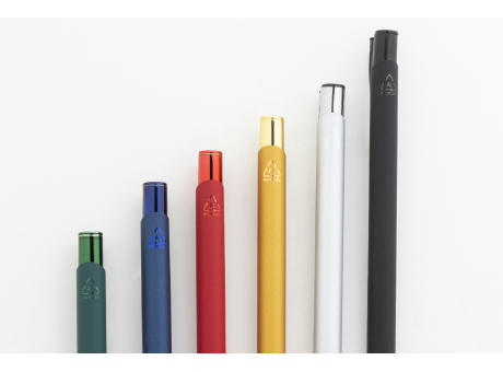Kugelschreiber aus recyceltem Aluminium mit gummiertem Gehäuse und farbig glänzenden Metallteilen, blauschreibend. Mit Spezialbeschichtung für Spiegelgravur passend zu den Metallteilen.